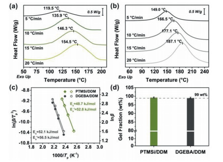 The non-isothermal curing behaviors of the two formulations are displayed in Fig. 1, where they reveal similar curing behaviors. All the heating curves were only observed a single curing exothermic peak, which was corresponded to the curing reaction between epoxides and amines. Compared to DGEBA/DDM, the curing exothermic peak shapes of PTMSi/DDM were slightly flat. This was because the curing reaction process with amines became more complicated after the increase of reactive epoxides. As the curing progressed, a large number of permanent crosslinks hindered the probability of effective collisions between secondary amine and epoxides. According to the curing exothermic peak temperature at each heating rate, PTMSi was able to cure with DDM under milder conditions than DGEBA did. Similarly, the curing reaction activation energy (Ea) calculated by Kissinger and Ozawa methods also indicated the high reactivity of PTMSi, and the curing reaction was more likely to occur than conventional epoxy formulation (Fig. 1c). Furthermore, the cured network of PTMSi/DDM was highly complete as its gel content reached more than 99 wt% (Fig. 1d).