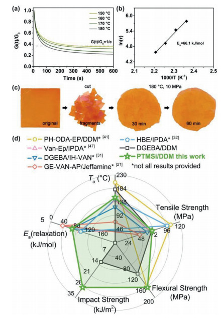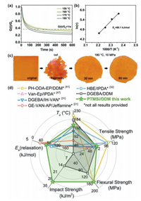 | Fig. 4. Malleability of PTMSi/DDM. (a) Normalized relaxation modulus versus time curves at different temperatures. (b) Fitting of the relaxation times to the Arrhenius' equation. (c) Reprocessing experiment. (d) Radar map probing optimal α transition temperature (Tα), mechanical strengths and relaxation activationenergy (Ea) of different Schiff base-containing biobased and conventional epoxyresins. | |