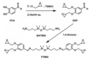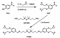 In order to prevent the formation of benzodioxane derivatives between phenolic compounds with ortho hydroxyl groups and epichlorohydrin [47], the synthesis of PTMSi started from the glycidylation of protocatechualdehyde (PCA). Then the epoxy monomer was obtained through a common aldehyde-amine condensation reaction, as shown in Scheme 1. The relevant structural characterization is shown in Figs. S1–S5 (Supporting information); and the good processability of the liquid epoxy monomer was proved by rheological analysis (Fig. S6 in Supporting information).