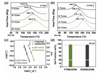 | Fig. 2. Thermal properties of PTMSi/DDM and DGEBA/DDM as a comparison. (a) TG and DTG thermographs and (b) DSC curves at a heating rate of 10 ℃/min. (c) DMA spectra for the storagemodulus (G') and tanδ against temperature at a heating rate of 5 ℃/min. | |