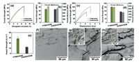 | Fig. 3. Mechanical properties of PTMSi/DDM and DGEBA/DDM as a comparison. (a) Stress-strain curves and (b) tensilestrength and modulus. (c) Strength-displacement curves and (d) flexural strength and modulus. (e) Unnotched Izod impact strength. SEM images of different morphologies of (f) DGEBA/DDM and (g, h) PTMSi/DDM impact fracture surface, respectively. | |