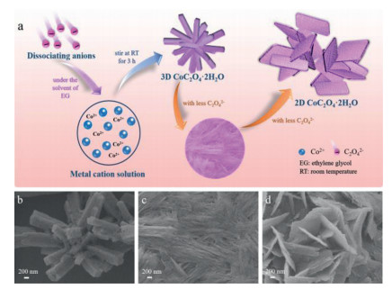 | Fig. 1. (a) Schematic illustration of the morphology growth trend of 2D CoC2O4·2H2O under EG solvent. SEM images of CoC2O4·2H2O with different morphologies. The specific molar ration of Co(Ac)2·4H2O to (NH4)2C2O4·H2O of (b) 1:5, (c) 1:1, (d) 5:1. | |
