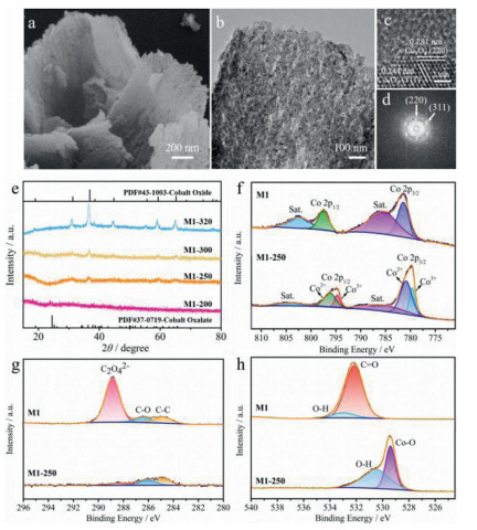 | Fig. 3. (a) SEM image, (b) TEMimage, (c) HRTEM image and (d) corresponding FFT pattern of M1-250. (e) XRD patterns of M1-200, M1-250, M1-300, M1-320. High resolution (f) Co 2p, (g) C 1s and (h) O 1s XPS spectra of M1 and M1-250. | |