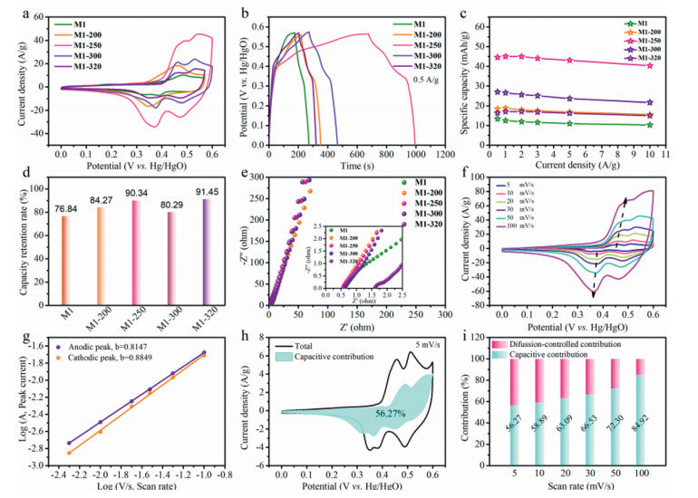 | Fig. 4. Electrochemical performance of as-prepared electrodes (M1, M1-200, M1-250, M1-300, M1-320) in a three-electrode cell with 3.0 mol/L KOH aqueouselectrolyte. (a) CV curves at 50 mV/s. (b) GCD curves at 0.5 A/g. (c) The specific capacity at various current densities (from 0.5 A/g to 10 A/g). (d) The retention rates of specific capacity when the current density increased from 0.5 A/g to 10 A/g. (e) The electrochemical impedance (EIS) spectra at room temperature, the insert shows the enlarged plots. (f) CV curves of M1-250 electrode at different scan rates. (g) The plots of log(peak current) against log(scan rate) for M1-250 electrode. (h) Total current (black line) and capacitive-contributed current (shadow area) of M1-250 electrode at 5 mV/s. (i) Relative contributions of different charge storage contribution of M1-250 electrode at various scan rates. | |