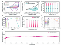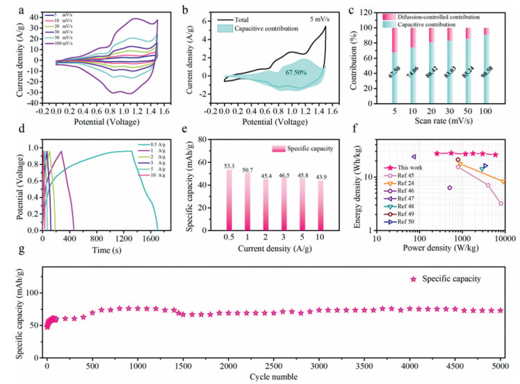| Fig. 5. Electrochemical performance of the M1-250//AC aqueous device: (a) CV curves at various scanning rates from 5 mV/s to 100 mV/s. (b) Total current (black line) and capacitive-contributed current (shadow area) at 5 mV/s. (c) Relative contributions of diffusion-controlled and capacitive processes at various scanning rates. (d) GCD curves and (e) specific capacity at various current densities from 0.5 A/g to 10 A/g. (f) Ragone plot for the assembled M1-250//AC aqueous device in comparison with some reported results. (g) Cycling performance of M1-250//AC at 5 A/g for 5000 cycles. | |