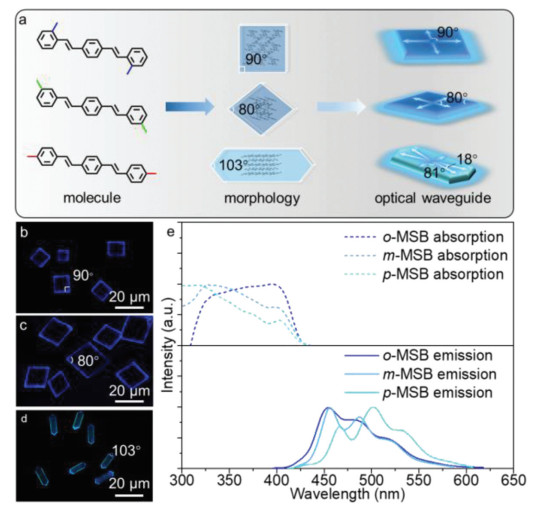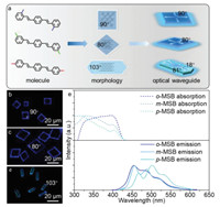 | Fig. 1. (a) Schematic diagram of three shape-dependent multi-directional 2D optical waveguides with different performances obtained by rational molecular design strategy based on isomer skeleton. Fluorescencemicroscopy images of (b) o-MSB, (c) m-MSB and (d) p-MSB organic microsheets with a scale bar of 20 µm. (e) Absorption (dashed line) and emission (full line) spectrum of the three microsheets. | |