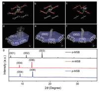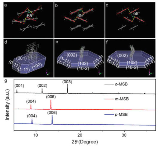 | Fig. 2. (a–c) The π-π stacking of (a) o-MSB, (b) m-MSB and (c) m-MSB molecules. The red line represents the plane where the molecule is located, and the yellow line represents the π-π stacking between the molecules. The simulated growth morphology of (d) o-MSB, (e) m-MSB and (f) p-MSB based on the attachment energies using the Materials Studio package. (g) The XRD pattern of the as-prepared o-MSB, m-MSB and p-MSB organic microsheets. | |