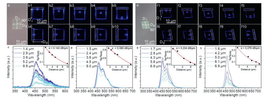 | Fig. 3. (a) Brightfield micrograph of a typical o-MSB microsheet. (b) Microarea PL images obtained by exciting an identical o-MSB microsheet at different positions in direction Ⅰ (b1–b5) and direction Ⅱ (b6–b10). Spatially resolved PLspectra from the edge of the o-MSB microsheet (marked with a dashed frame) for different separation distances between the excitation spot and the edge in (c) direction Ⅰ and (d) direction Ⅱ. The inset: nonlinear fitting curve of optical waveguide loss. α: the opticalloss coefficient. (e) Brightfield micrograph of a typical m-MSB microsheet. (f) Microarea PL images obtained by exciting an identical m-MSB microsheet at different positions in direction Ⅰ (f1–f5) and direction Ⅱ (f6–f10). Spatially resolved PL spectra from the edge of the m-MSB microsheet (marked with a dashed frame) for different separation distances between the excitation spot and the edge in (g) direction Ⅰ and (h) direction Ⅱ. | |