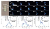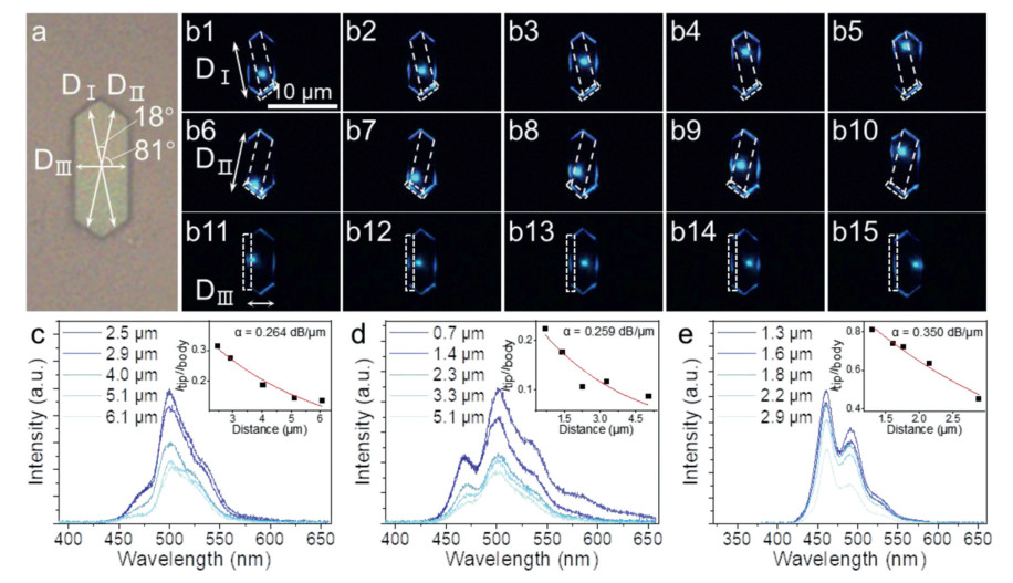 | Fig. 4. (a) Brightfield micrograph of a typical p-MSB microsheet. (b) Microarea PL images obtained by exciting an identical p-MSB microsheet at different positions in direction Ⅰ (b1–b5), direction Ⅱ (b6–b10) and direction Ⅲ (b11–b15). Spatially resolved PLspectra from the edge of the p-MSB microsheet (marked with a dashed frame) for different separation distances between the excitation spot and the edge in (c) direction Ⅰ, (d) direction Ⅱ and (e) direction Ⅲ. The inset: nonlinear fitting curve of optical waveguide loss. α: the opticalloss coefficient. | |