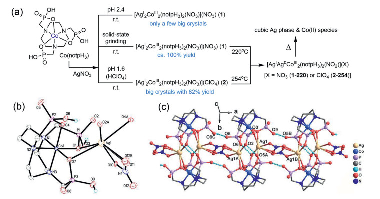 The thermal decomposition of silver nitrate is well known to obtain metallic Ag, NO2, and O2. The resulting Ag(0) atoms usually aggregate and can be a precursor to synthesize the Ag NPs. We conjecture that Ag(0) atoms would be trapped in coordination spheres and atomically dispersed when AgNO3 thermally decomposes in CPs/MOFs. To obtain such a compound is trouble in the combination of NO3− and a ligand within the same coordination sphere of Ag(Ⅰ). In our previous work, the neutral mono-nuclear complex Co(notpH3) [notpH6 = 1, 4, 7-triazacyclononane-1, 4, 7-triyl-tris(methylene-phosphonic acid)] can serve as a bi-, tri- or tetra-dentate metalloligand to ligate various metal cations [24-28]. Herein, we report two new Co(notpH3) based one-dimensional Co-Ag coordination polymers [Ag2ⅠCo2Ⅲ(notpH3)2(NO3)](NO3) (1) and [Ag2ⅠCo2Ⅲ(notpH3)2(NO3)](ClO4) (2). Compound 1 can be synthesized by simply grinding the mixture of Co(notpH3) and AgNO3 solid (Fig. 1a). Each coordinated NO3− anion bridges two Ag(Ⅰ) ions within the chains in both η2- and η1-forms.