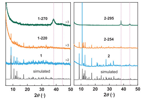Insights into the structural transformation during decomposition are provided by powder XRD measurements for selected samples annealing at different temperatures (220 and 270 ℃ for 1; 254 and 295 ℃ for 2) shown in Fig. 3. The PXRD patterns of 2–254 remain almost when heating 2 to 254 ℃, indicating that the assembly of Co(notpH3) units does not change and Ag atoms are still embedding in the chains structures. The fitted cell parameters of 2–254 are similar to those of 2 (Fig. S7 and Table S4 in Supporting information). When the annealing temperature reaches 295 ℃, 2 undergoes the secondary weight loss, and the resulting solid 2–295 becomes a crystalline-amorphous composite. All observed diffraction peaks at 2θ = 38.2°, 44.4° and 64.5° can be assigned to crystalline Ag with cubic (Fm-3m) lattice (Fig. S6 and Table S1 in Supporting information). For 1, the diffraction peaks caused by the crystalline H-bonded assembly are still evident after annealing at 220 ℃. Furthermore, the PXRD pattern of 1–270 confirms the generation of crystalline Ag.