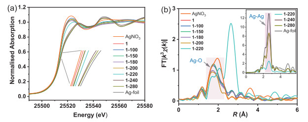 | Fig. 4. (a) Ag K-edge XANESspectra and (b) Fourier transformed space (R space) at Ag K-edge of 1 and its thermally treated samples. The spectra of Ag-foil and AgNO3 were recorded as a comparison. | |