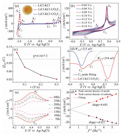 Then the electrode reaction of UO22+ was studied in LiCl-KCl melts on Mo electrode at 773 K using cyclic voltammetry (CV) shown in Fig. 2a. In the black line, peaks C1 and A1 are attributed to the deposition and dissolution of metallic Li. While UO22+ was added into LiCl-KCl melts, the color of the molten salt change from colorless to yellow shown in the inset of Fig. 2a, which is exactly the color of UO22+ dissolved in molten salt. In the red line, four new anodic peaks, A2, A2', A3 and A4, are observed at −2.21 V, −1.42 V, 0.27 V and 0.54 V, respectively. Only three cathodic peaks, C2, C3 and C4, are observed at −2.45 V, −0.31 V and 0.32 V, respectively. The redox couple C4/A4 may be correlated with the soluble/soluble redox process of UO22+/UO2+.
