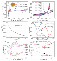 | Fig. 2. CV curves of UO22+ at (a) 0.1 V/s and (b) various scan speed. (c) The relationship of electricity amount and scan speed. (d) SWV curve of UO22+ at 20 Hz. (e) Various frequencies, and (f) fitting line of peak current density versus square root of frequency (f1/2). | |