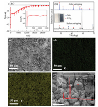 The XRD spectra of the product gained shown in Fig. 3b indicates the formation of UO2 successfully and the color of the Mo plate changes from metallic luster to black, as shown in inset of Fig. 3b. After stripping off the UO2 from the electrode, the diffraction peaks in XRD spectra shown in Fig. 3b became stronger and sharper, showing the deposited UO2 has a high crystallinity. The morphology and element distribution were characterized, as shown in Figs. 3c-f, the UO2 is unevenly distributed on the electrode surface in a dendritic state. EDS analysis also proved the formation of UO2. Before and after the run, the concentration of U in the melts was analyzed by ICP-AES and the extraction efficiency was calculated using Eq. 12. The calculated result indicated that after 8 h electrolysis, the extraction of UO2 can reach 98.53%.