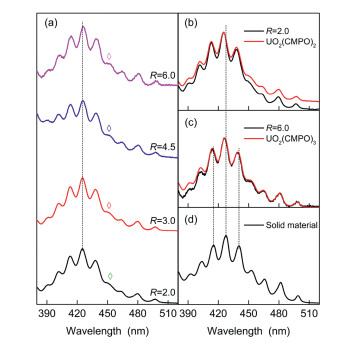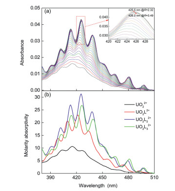 Factor analysis by HypSpec program [27] suggested the presence of four absorption species in the system, i.e., free UO22+ and three successive complexes like UO2L2+, UO2L22+, and UO2L32+. Fit converged well at the stability constants (logβ) of 4.82 (5), 9.39(12), and 12.98(5) for complex UO2L2+, UO2L22+, and UO2L32+, respectively. The calculated molar absorption spectra of the species are depicted in Fig. 3b. The better-defined vibronic fine structure and sharper absorption bands clued that uranyl(Ⅵ) complexed with CMPO in an ordered ligand field [25, 28]. The spectrum changes of the titration system (Fig. 3a) can be interpreted with the quite different spectra of uranyl(Ⅵ) species and their concentration changes in the solution. For instance, Absorbancy of complex UO2L32+ is weaker than that of complex UO2L22+, responsible for the spectrum intensity decreased in the titration system when R > 2.32.