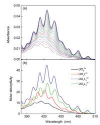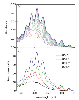 | Fig. 4. Spectrophotometric titration of UO2(NTf2)2 with CMPO in HOEtmimNTf2. Initial solution: V0 = 2.0 mL, CU0 = 1.5 mmol/L, titrant: CL = 97.4 mmol/L, 0.096 mL added. (a) Spectra of the titration system normalized to the initial concentration of uranyl(Ⅵ); (b) Molarabsorptivity of the species found in the titration system. | |