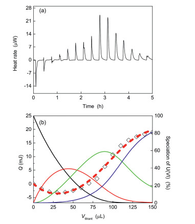 | Fig. 5. Representative microcalorimetric titration of uranyl(Ⅵ)/CMPO complexation in HOEtmimNTf2. (a) Titration thermograms; (b) cumulative reaction heat (black ◊ for experimental data (left y-axis), and: the red short dash line for the calculated results) and the uranyl(Ⅵ) species (right y-axis, black line: UO22+, red line: UO2L2+, green line: UO2L22+, and blue line: UO2L32+) as a function of the titrant volume (Vtitrant, µL). Initial solution in the cup: 0.800 mL of UO2(NO3)2 solution (2.19 mmol/L) in HOEtmimNTf2, titrant: 40.0 mmol/L CMPO in HOEtmimNTf2. | |