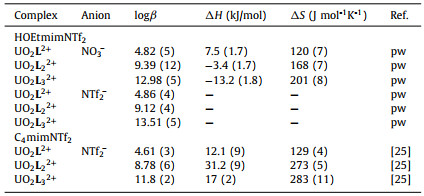 Table 1 Thermodynamic parameters of the complexation of uranyl(Ⅵ) with CMPO in ionicliquids. |