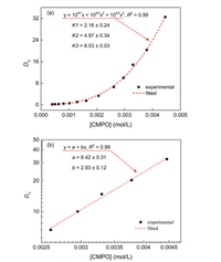 The formation of extraction complexes in the biphasic extraction system is essential to produce solid assembly material. Firstly we conducted extractions on a constant-temperature water bath shaker, with the aqueous phase with UO2(NO3)2 (no more than 1.0 mmol/L) in 1.0 mol/L HON3. Pre-experiments showed that no observably solid assembly material appeared at the inter-surface of the biphasic system in a day time when the initial uranyl(Ⅵ) concentration in 1.0 mol/L HNO3 solution was less than 1.0 mmol/L. Cation exchange has been presumed to be the partitioning mechanism for the biphasic metal extraction equilibrium with hydrophobic IL as diluent [1, 20-22]. Considering the stoichiometric ratio of the solid material obtained at the interface of the biphasic system [14], we hypothesized three successive extraction complexes formed possibly in the IL phase, i.e., UO2L2+, UO2L22+ and UO2L32+. The uranium distribution ratio (DU) should function as a cubic polynomial equation along with the CMPO concentration ([L]) in the IL phase (Eq. S5 in Supporting information). Fig. 1 depicts the UO2(NO3)2 extraction results by CMPO in HOEtmimNTf2 at 25 ℃. Fitting the extraction data with Eq. S5 based on the least square method, as shown the short dash line in Fig. 1a, the apparent equilibrium constants (Kexapp) for the three successive extraction complexes were obtained to be Kex,1app = 2.16 ± 0.24, Kex,2app = 4.97 ± 0.34, and Kex,3app = 8.53 ± 0.03, respectively. Interestingly that (Kex,3app-Kex,2app) > (Kex,2app-Kex,1app) > Kex,1app, suggests that, for this extraction system, uranium prefers to be extracted by the complexes of higher uranyl(Ⅵ) stoichiometric ratio, especially UO2L32+. It can be interpreted that along with the uranyl(Ⅵ) stoichiometric ratio increasing, the extraction complexes become more hydrophobic, which facilitates their transfer into the organic phase [21]. As illustrated in Fig. 1b, in a dual logarithmic coordinate system a fine linearship we observed between DU and [L] (2.6-4.5 mmol/L) with a slope of 2.93, suggesting complex UO2L32+ being the predominant extraction species [6].