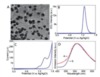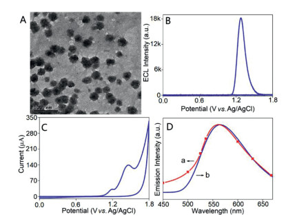 | Fig. 1. TEM image (plotting scale: 100 nm) (A), ECL (B), CV (C), ECL spectrum (D, a) and fluorescence spectrum (D, b) of conjugated polymer PNPs modified glassy carbon electrodes (GCEs) in a PBS solution (0.1 mol/L, pH 7.4). PNPs concentration: 100 mg/L, λex = 370 nm, scan rate: 100 mV/s, PMT = 800 V. | |