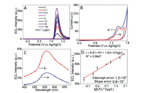 Electrochemiluminescence (ECL) involves an electron transfer process on the surface of electrodes to give excited states for luminescent signals, which can exhibit high sensitivity due to the ability to avoid scattered light and auto-luminescence backgrounds [8-11]. Except for this advantage, the simple operation and minimized instruments can also make ECL an outstanding choice in uranium warning system. Till now, ECL sensors have been employed in trace detection of various heavy metals, such as Pb2+ [12], Hg2+ [13], Cu2+ [14]. Among them, we discovered the anodic ECL behavior of UO22+ and firstly developed a ssDNA based ECL sensor for UO22+ detection with quite high selectivity and sensitivity (LOD: 2.5 ng/L, lower than ICP-MS detection) [15]. This is the first research for applying ECL technology in trace radioactive substances detection, which carried out a brand new and efficient strategy for accurate UO22+ monitoring in environment [15]. However, due to the complex modification, pretreatment and data analysis, this strategy still could not meet the requirements of rapidity, intuition and simplification requirement in the UO22+ warning of natural water sources.