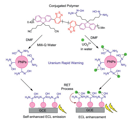 In summary, a conjugated polymer with self-enhanced ECL behavior was synthesized and prepared into PNPs for UO22+ rapid warning in drinking water source. This study discovered that amidoxime group, a most successful UO22+ capturing group, can also be applied as a co-reactive group in ECL measurement, indicating its bi-functional property. The captured UO22+ could enhance the ECL signal of conjugated polymer PNPs via RET process, which gave an ultra-low LOD value as 0.5 ng/L to U as well as high selectivity. ECL imaging technique was then successfully applied in this UO22+ warning system to realize visualized natural water source rapid monitoring. This study reported a novel strategy for UO22+ rapid warning in drinking water sources and exhibited its practical applications in environmental and public security fields.