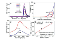 | Fig. 2. ECL of conjugated polymer PNPs modified GCEs with different UO22+ concentration in a PBS solution (0.1 mol/L, pH 7.4) (A); CVs (B) of PNPs; ECL spectra of PNPs (a) and PNPs with 5 µg/L UO22+ (b) (C); calibration curve of ECL intensity versus logarithm value of UO22+ concentration (D) in a PBS solution (0.1 mol/L, pH 7.4). PNPs concentration: 100 mg/L, scan rate: 100 mV/s, PMT = 800 V. | |