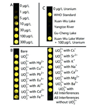 Nowadays, nuclear power has exhibited its significance in providing large amounts of energy without producing greenhouse gases [1], taking up about 10% of the global power according to the statistics of the World Nuclear Association. As a kind of main nuclear fuel, uranium has been widely applied in nuclear power plants, which is also regarded as a hazardous element with long half-life (450 million years) as well as high radioactivity and chemical toxicity [2]. Due to some human activities such as mining and war, billions of tons depleted uranium ores, residues and weapons have been abandoned, which has become a large threat to environment and human's health [3]. As the most stable form of uranium in environment, uranyl ion (UO22+) is severely limited in drinking water sources by the World Health Organization (WHO, less than 30 µg/L) [2]. Therefore, it is necessary to develop an accurate and rapid sensing system for the uranium warning of drinking water sources.