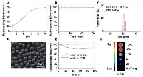 | Fig. 1. (A) Radiolabeling efficiency as a function of pH. (B) Radiolabeling efficiency as a function of reaction time. (C-D) Histogram and SEM image of Lu-microspheres. (E) Radiostability of 177Lu-microspheres in saline and 10% FBS. (F) Tube phantom image of 177Lu-microsphere suspensions with radioactivity varying from 0 to 1000 µCi/mg. | |