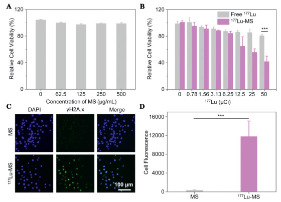 | Fig. 2. (A) Relative viability of HepG2 cells incubated with silica microspheres (MS) at different concentrations. (B) Relative viability of HepG2 cells incubated with 177LuCl3 and 177Lu-microspheres with radioactivity varying from 0 to 50 µCi for 24 h (C) Immunofluorescence assays of HepG2 cells incubated with MS (0.5 mg/mL) and 177Lu-microspheres (0.5 mg/mL, 200 µCi/mL), respectively. (D) Quantification of the immunofluorescence signal. P values were calculated by One-way ANOVA with Tukey multiple comparison tests, *** P < 0.001. | |