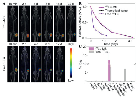 | Fig. 3. (A) SPECT/CT images of HepG2 tumor-bearing mice intratumorally injected with 177Lu-microspheres (1 mCi) (denoted as 177Lu-MS) and 177LuCl3 (100 µCi) (denoted as Free 177Lu). (B) Relative temporal activity of the tumorous regions overlaid with a theoretical decay curve for 177Lu. (C) Biodistribution of 177Lu obtained 12 d and 32 d after the delivery in the form of 177LuCl3 and 177Lu-microspheres, respectively. | |