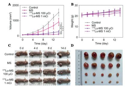 | Fig. 4. (A, B) Tumor volume and body weight of HepG2 tumor-bearing mice treated with saline (control), MS (50 mg/kg), 177Lu-microspheres with different radioactivity (i.e., 100 µCi and 1 mCi), respectively. (C) Photographs of representative HepG2 tumor-bearing mice recorded during the treatment. (D) Photograph of tumors extracted 14 d post-treatment. P values were calculated by One-way ANOVA with Tukey multiple comparison tests, **P < 0.01, ***P < 0.001. | |