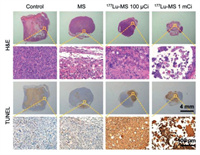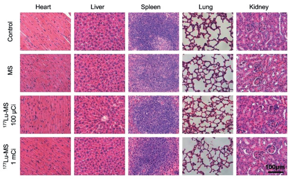 The tumor and main organs including heart, liver, spleen, lung, and kidney of the mice receiving different treatments were sliced and then subjected to hematoxylin and eosin (H & E) and TUNEL staining. As shown in Fig. 5, the treatment with 177Lu-microspheres can apparently give rise to remarkable necrosis and apoptosis in comparison with the control group and silica microspheres group. More importantly, the H & E staining reveals that nearly no damage was created by the 177Lu-microspheres groups to major organs as given in Fig. 6.