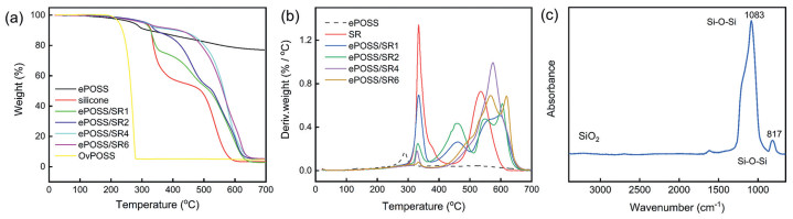 | Fig. 1. (a) TG and (b) DTG thermograms of ePOSS, SR and ePOSS/SR nanocomposite in the nitrogen atmosphere; (c) FTIR spectra of the residue remaining after ePOSS was heated to 700 ℃. | |