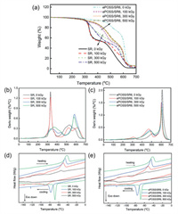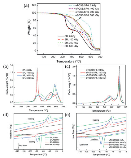 | Fig. 3. TG (a) and DTG thermograms (b, c) of both SR and ePOSS/SR nanocomposite with different absorbed doses in the nitrogen atmosphere; DSC curves (d, e) of SR and ePOSS/SR nanocomposite with different absorbed doses in helium atmosphere. | |