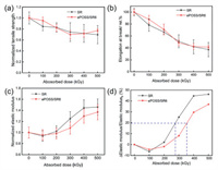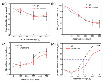 | Fig. 4. Tensilestrength (a), elongation at break (b), Young'smodulus (c) and the rate of change in Young's modulus (d) of both SR and ePOSS/SR6 nanocomposites with different absorbed doses (in air). | |