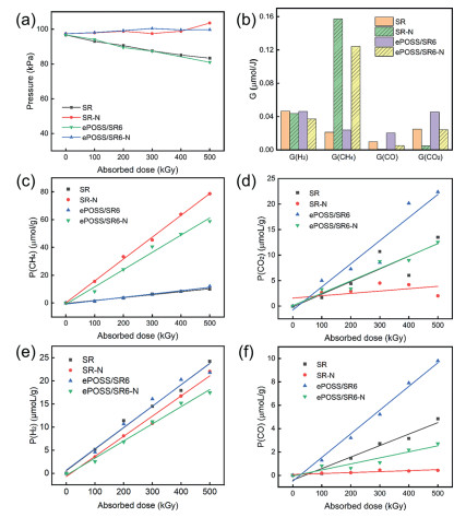 | Fig. 5. (a) The pressure in the sample tube fitted with SR, SR-N, ePOSS/SR6 and ePOSS/SR6-N after irradiation with different absorbed doses; (b) G-value of H2, CH4, CO and CO2 of SR, SR-N, ePOSS/SR6 and ePOSS/SR6-N; the output of CH4 (c), CO2 (d), H2 (e) and CO (f) produced by SR, SR-N, ePOSS/SR6 and ePOSS/SR6-N after irradiation with different absorbed doses. | |
