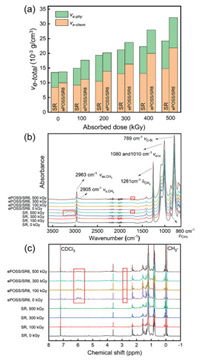 | Fig. 2. In the air, the ve of SR and ePOSS/SR6 nanocomposites at different absorbed doses (a); ATR-FTIR spectra of SR and ePOSS/SR6 nanocomposites with different absorbed doses (b) and 1H NMR spectra of soluble substance from SR to ePOSS/SR6 nanocomposites dissolved in CDCl3 before and after irradiation (c). | |