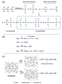 | Fig. 6. (a) γ-Radiation induced crosslinking mechanism of PDMS; (b) The gas-releasing mechanism by the hydrogen pumping reaction of the methyl side chain of PDMS [27]. (c) The radiation induced crosslinking and degradation mechanism of ePOSS/SR6 at different atmosphere. | |