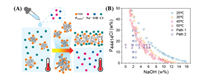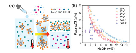 | Fig. 1. (A) Phase separation process of the P44414Cl-NaOH-H2O system, (B) the binodal curves for the P44414Cl-NaOH-H2O system at various temperatures and the composition of mixture points in paths 1 and 2 studied. | |
