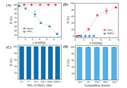 Taking the 99Tc problem for an example, as a long-lived β-emitting radionuclide, it is generated from the fission of 235U and 239Pu in nuclear reactors [19, 20], and is stored in the waste tanks with high alkalinity after recovery of nuclear materials [21]. The long half-life (2.13 × 105 years) and high thermal neutron fission yield (6.1%) make this radionuclide a long-term threat to human health [22]. What is more, the major species of 99Tc (i.e., 99TcO4-) has a vast solubility in water and high environmental mobility, leading to severe leakage of this hazardous anion [23, 24]. To avoid this pollution, it is highly desired to treat 99TcO4- in the alkaline tank waste. However, the content of 99Tc in the waste tank is very low (5 ppm) and the alkalinity is very high, making the treatment of 99TcO4- very challenging [25]. The state of art 99Tc removal techniques are mainly focused on the adsorption process based on novel cationic materials which were operated under pH ranges that might not be suitable for treating waste water with OH- concentration as high as 2 mol/L [26-30].