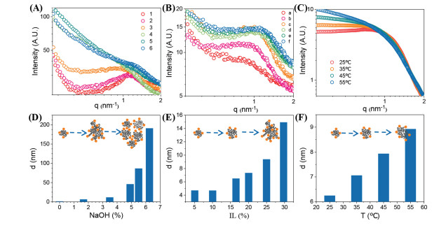 Similar but weaker changes in the SAXS patterns and micelle diameter could be observed with increasing temperature (Figs. 3C and F) and P44414Cl concentration (Figs. 3B and E). The mixture used in the temperature study was referred to the point c, path 2 in Fig. 1B. The SAXS patterns also became smooth as the temperature increased from 25 ℃ to 55 ℃, companying with the increase of micelle size. The experiments of P44414Cl concentration were carried out according to mixtures a-f from path 2 in Fig. 1B, whose SAXS patterns kept their peaks around 1.14 nm-1. The dynamic diameter varied from 5 nm to 14 nm when the P44414Cl concentration changed from 5% to 30%. Comparing the results of the three variables, we can conclude that the NaOH concentration has a much stronger effect on the trigger of the micelle aggregation than temperature and IL concentration for its stronger effect on the change of critical micelle concentration. The growth and aggregation of phosphonium micelle would finally connect the separated micelles and generate a new aqueous phase immiscible with the NaOH solution [44, 45].