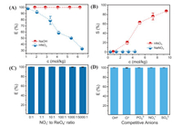 | Fig. 2. (A) Extraction efficiency of ReO4- by P44414Cl-NaOH and P44414Cl-HNO3 ABS, (B) stripping ratio of ReO- using HNO3 and NaNO3, (C) effect of competing NO3- anions on the extraction of ReO4- by P44414Cl-NaOH ABS, and (D) effect of different competing anions (1000 times) on the extraction of ReO4- by P44414Cl-NaOH ABS. | |