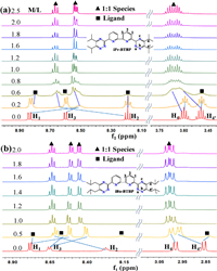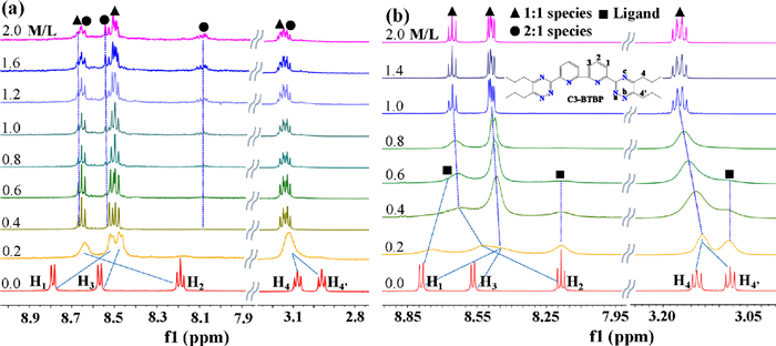 | Fig. 3. (a) Stacked 1H NMR spectra of C3-BTBP (10 mmol/L) titrated with Pd(NO3)2; (b) titrated with Pd(BF4)2 in CD3CN at 295 K. | |