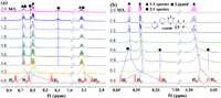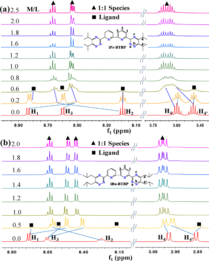 | Fig. 4. Stacked 1H NMR spectra of (a) iPr-BTBP (10.0 mmol/L) and (b) iBu-BTBP (10.0 mmol/L) titrated with Pd(NO3)2 in CD3CN at 295 K. | |