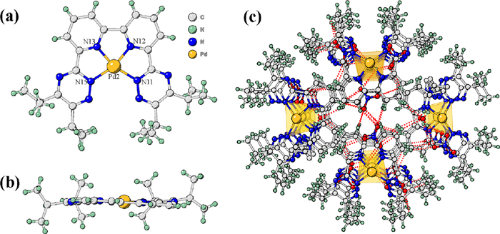 For the solid Pd(Ⅱ)/R-BTBP complexes, only one 1:1 Pd(Ⅱ)/iPr-BTBP complex has been isolated and structurally characterized. This is the first time that the solid 1:1 Pd(Ⅱ) complex with any R-BTBP type ligands has been successfully characterized by single X-ray crystallography, although many attempts have been tried by other researchers using CyMe4-BTBP or tBu-CyMe4-BTBP as chalets [32, 47]. As presented in Figs. 5a and b, the geometry of Pd(Ⅱ) exhibits a distorted square-planar with one iPr-BTBP molecular binding as a quadridentate ligand with central Pd(Ⅱ). The bond distances from Pd to N11 and N15 are 2.032(6) Å and 2.028(6) Å, respectively, which are longer than those to the pyridine nitrogen atoms ranging from 1.918(5) Å to 1.930(7) Å. The almost identical bond lengths of Pd-N13 to Pd-N12, and Pd-N11 with that of Pd-N15, are in line with the symmetry feature of the 1:1 Pd(Ⅱ)/iPr-BTBP complex as identified in its 1H NMR spectra (Fig. 4a). Similar bond distances of Pd-N have also been found in Pd(Ⅱ)/terpy [48] and Pd(Ⅱ)/BTP [49] complexes. Additionally, two nitrate anions were found in the second coordination player to keep the charge balance via the formation of hydrogen-bonding interactions with water molecules and ligands (Fig. 5c).