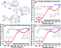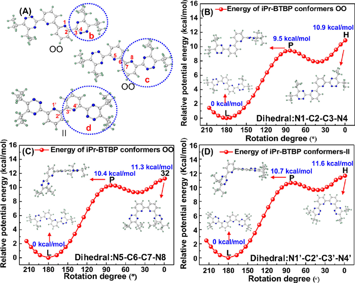 | Fig. 6. (A) Three dihedralangles (b) N1-C2-C3-N4, (c) N5-C6-C7-N8 and (d) N1′-C2′-C3′-N4′ defined for the rotationalenergy calculations. Relative potential energy curves of iPr-BTBP (B) from initial OO to the final IO conformation, (C) from initial OO to the final coordinated OO conformation, (D) from initial Ⅱ to the final coordinated Ⅱ conformation. | |