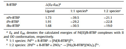 In summary, R-BTBP type ligands were found to have two different initial conformations, which exhibit significant effect on their complexation behaviors with Pd(Ⅱ). It was found that both the 1:1 and 2:1 binuclear complexes could be formed between Pd(Ⅱ) and R-BTBP with initial Ⅱ conformation in the presence of nitrate anions, while without nitrate anions only one 1:1 species could be formed. For those R-BTBP with initial OO conformation, only the 1:1 type Pd(Ⅱ) complexes were formed. The solid structure of the 1:1 iPr-BTBP/Pd(Ⅱ) complex has been firstly characterized by X-ray crystallography and it has the typical 4-coordinate square-planar geometry. The results of DFT calculation studies demonstrated that the all R-BTBP molecules in these Pd(Ⅱ) complexes adopt the stable Ⅱ conformation. Therefore, a significant large rotational energy barrier of 21.8–22.6 kcal/mol has restricted them to form the Ⅱ type 2:1 Pd(Ⅱ) complex for those OO type ligands. For those R-BTBP with initial Ⅱ type conformations, they are easy to form the 2:1 Pd(Ⅱ)/R-BTBP binuclear complex without needing conformational change. The results obtained in this work provide some new insights into the complexation behaviors of fission palladium with R-BTBP ligands, which can help us to better understand the physicochemical changes occurred in the macroscopic actinides separation process using R-BTBP type ligands and improve the separation efficiency.