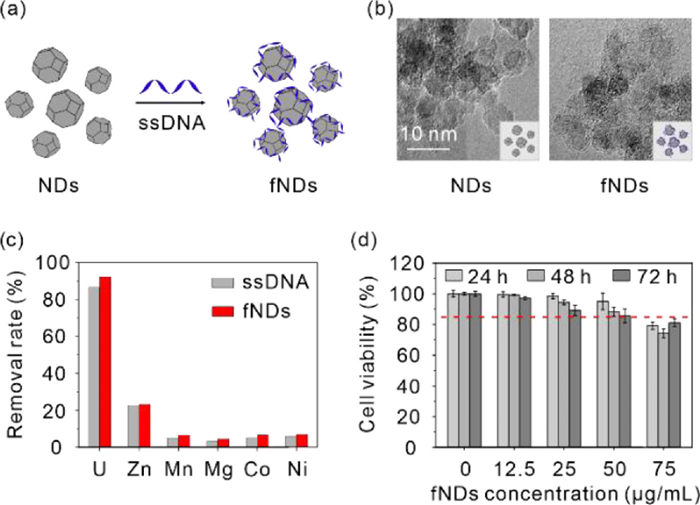Herein, the uranium removal effect of single strain deoxyribonucleic acid (ssDNA) fragments was investigated, demonstrating their high uranyl binding affinity and selectivity. Then functional nanodiamonds (fNDs) were obtained by loading ssDNA fragments on NDs to improve the stability in vivo and the cell uptake rate. The selectivity, cellular metabolic kinetics, and uranium removal efficiency of fNDs was investigated and the results show that fNDs could sufficiently enter the cells and decorporate uranyl effectively, suggesting the potential of ssDNA functionalized NDs as a brand-new type of actinide decorporation agents.